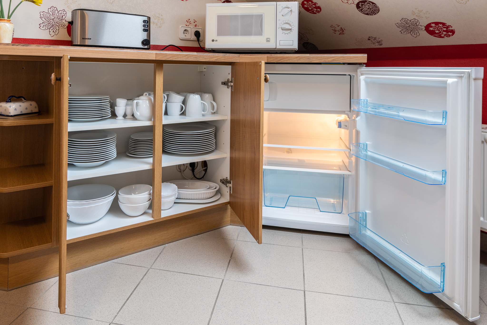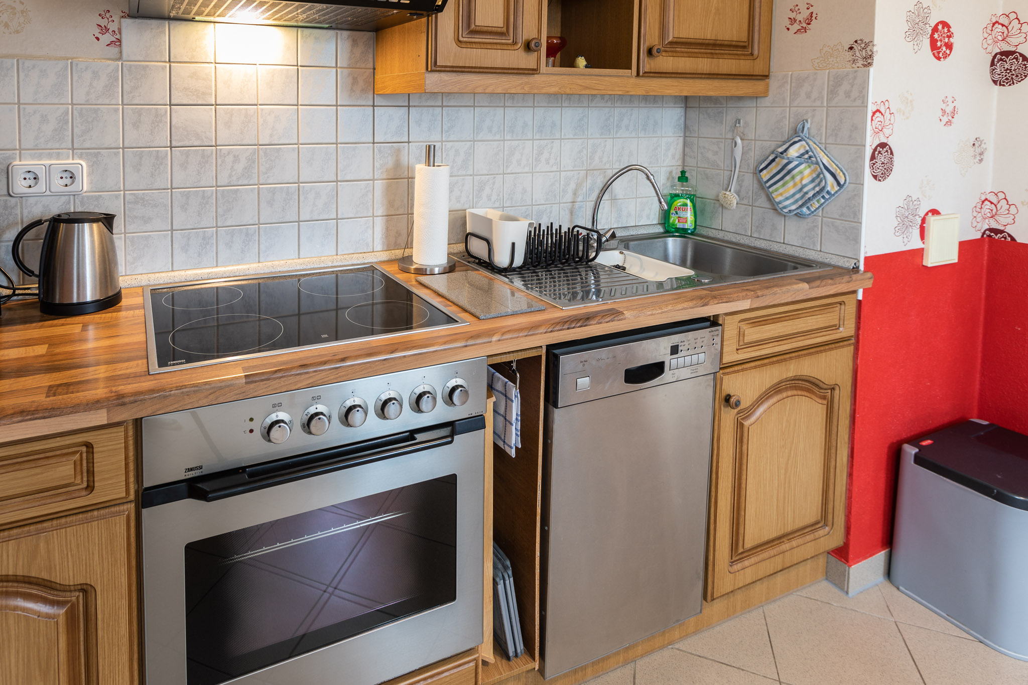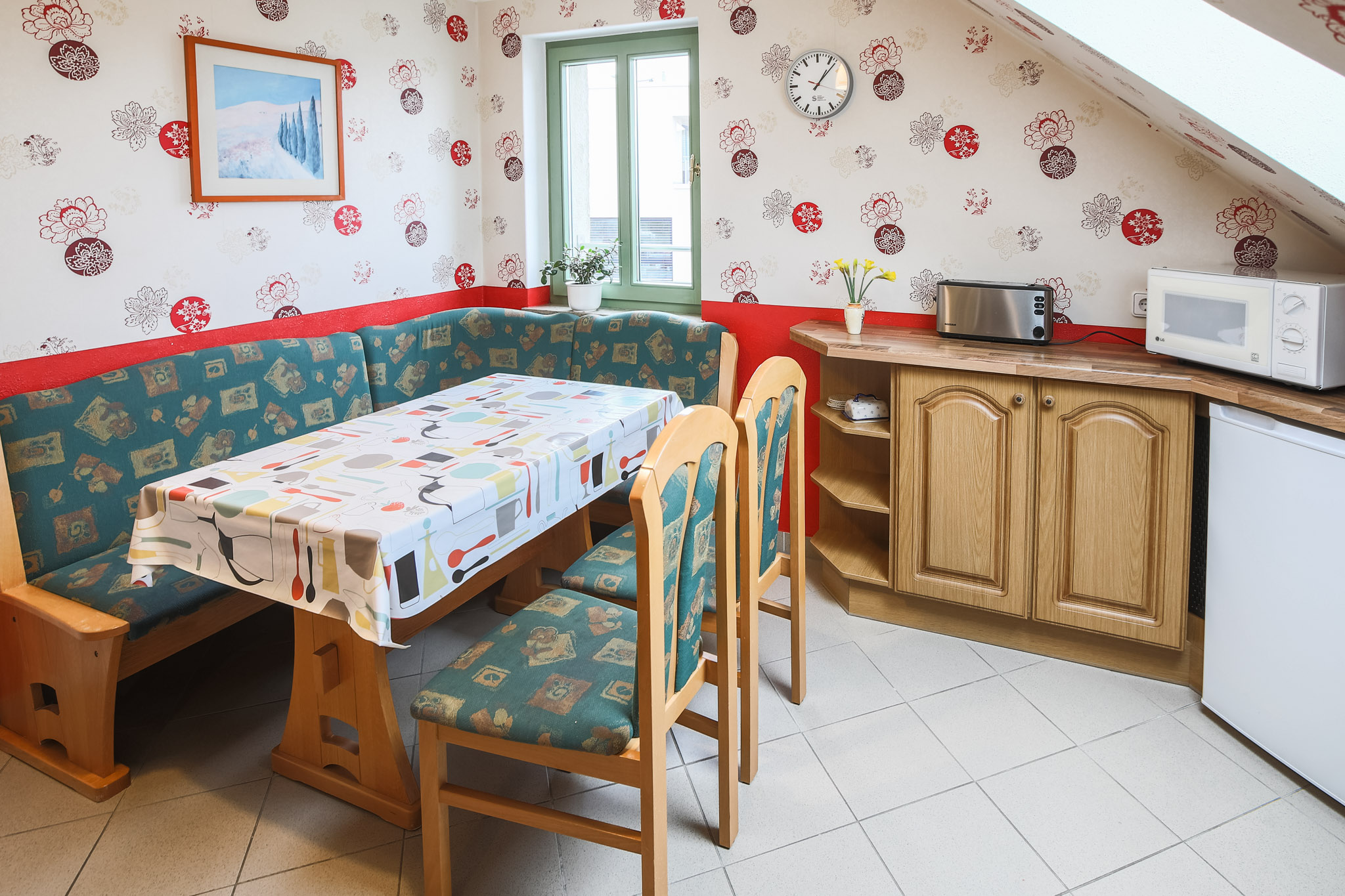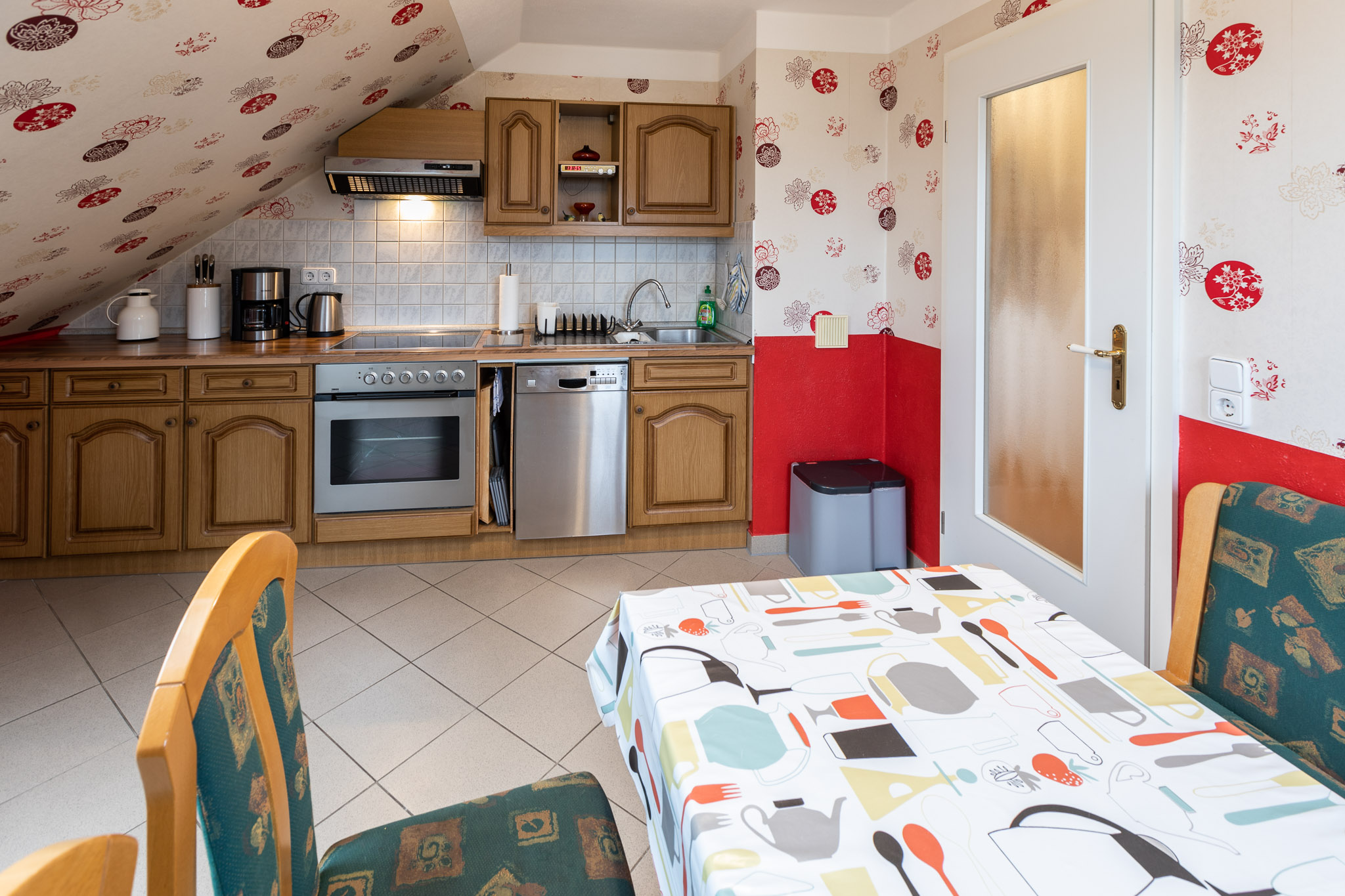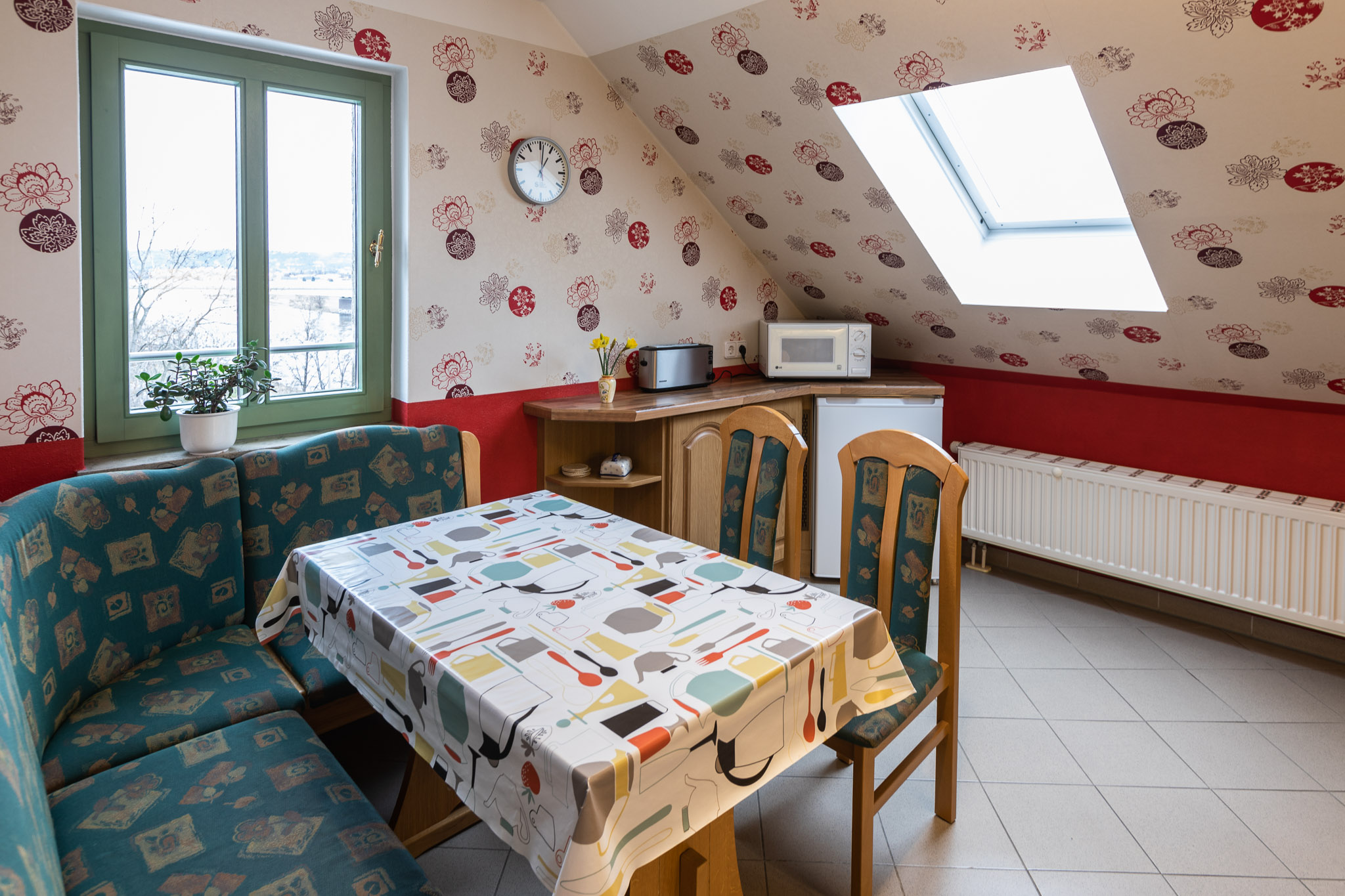 Essbereich mit Sitzecke, Einbauküche mit E-Herd und Ceranfeld, Geschirrspüler, Spüle, Kühlschrank mit Frost, Kaffeemaschine, Mikrowelle, Toaster, Wasserkocher, Grundgewürze