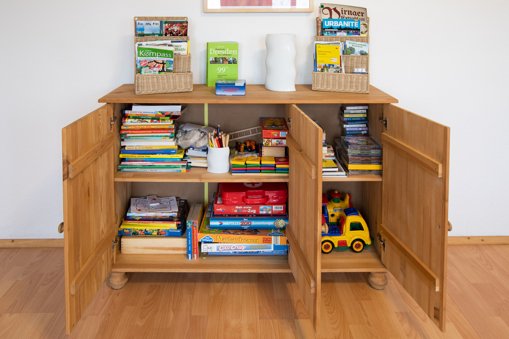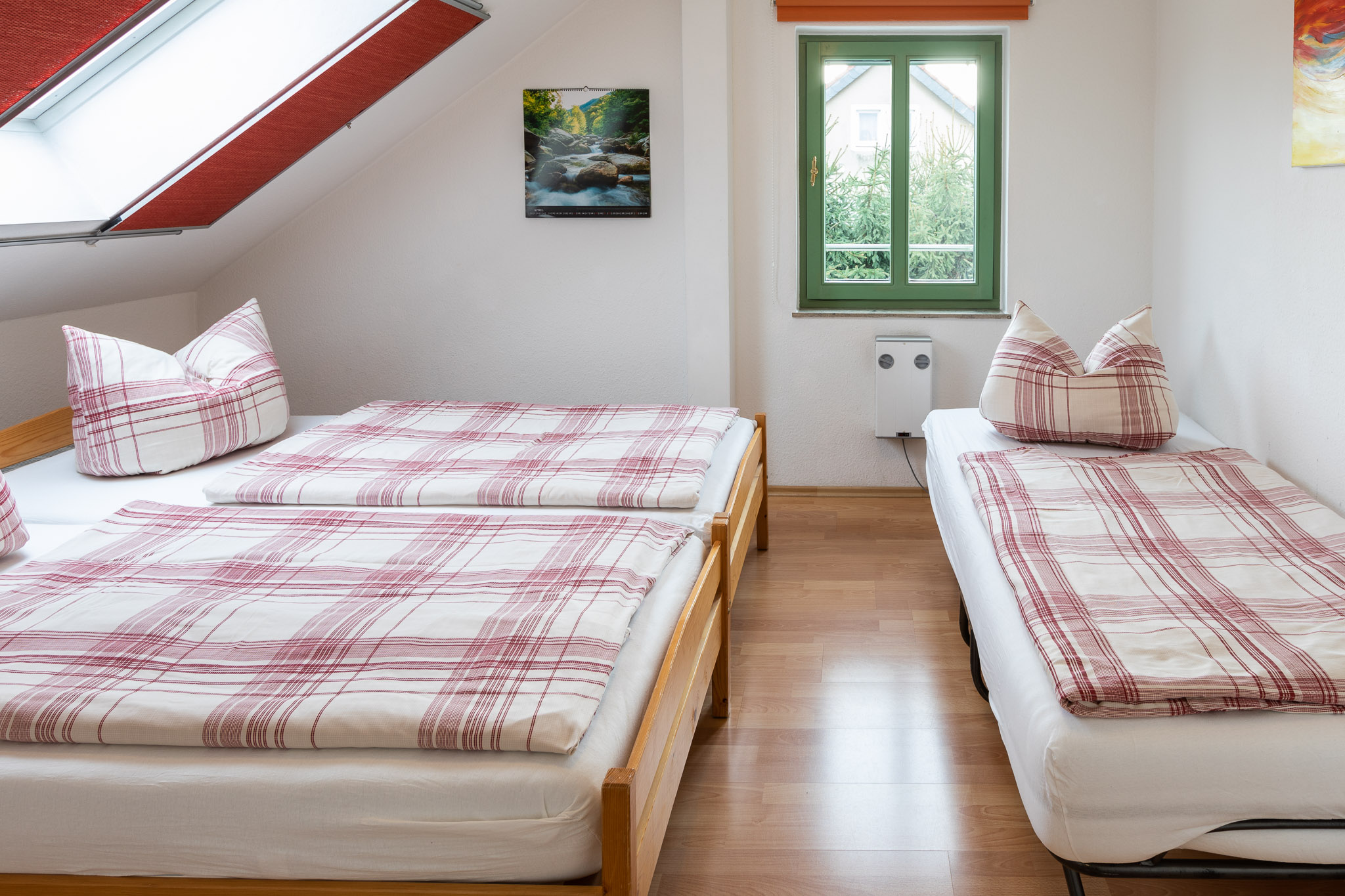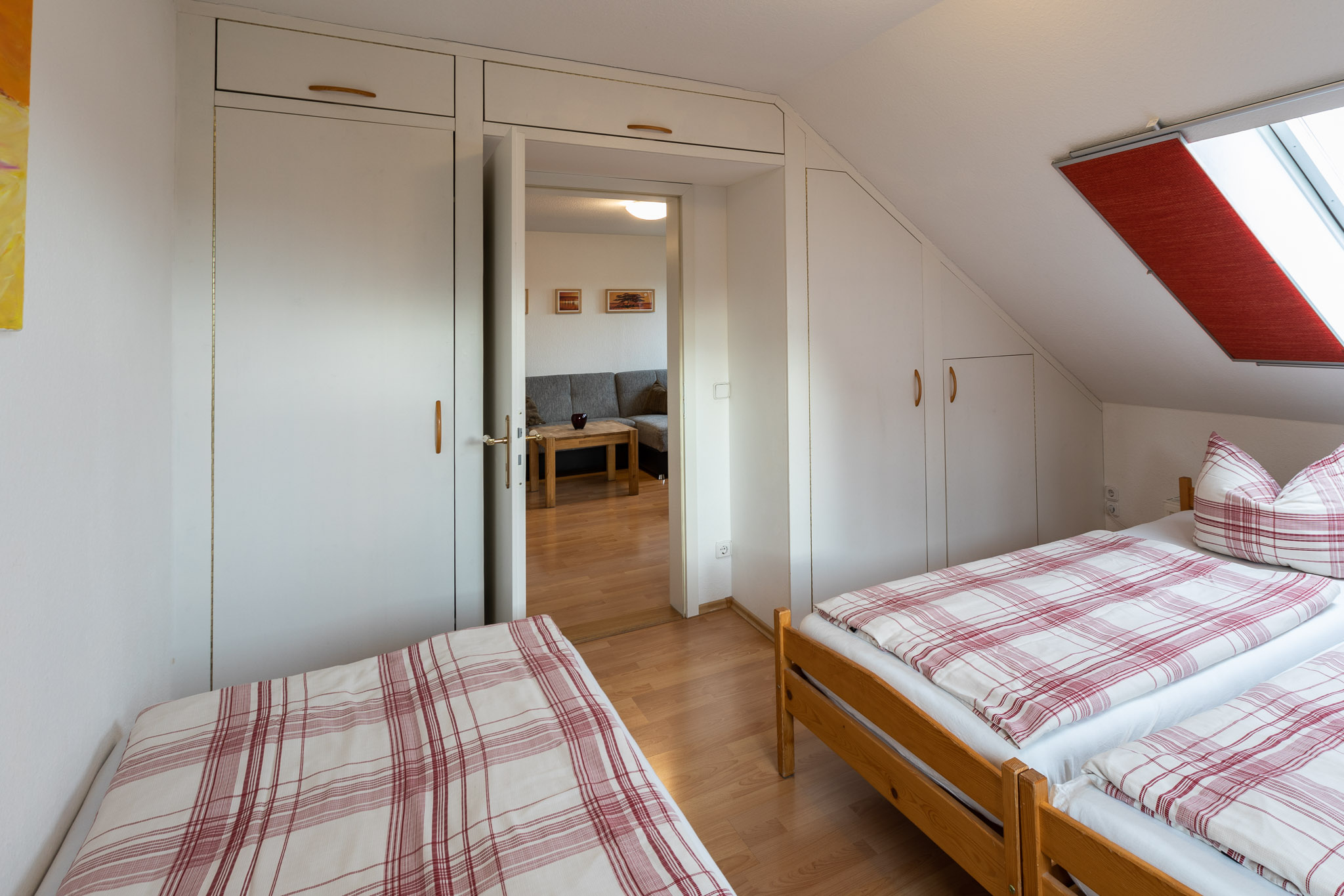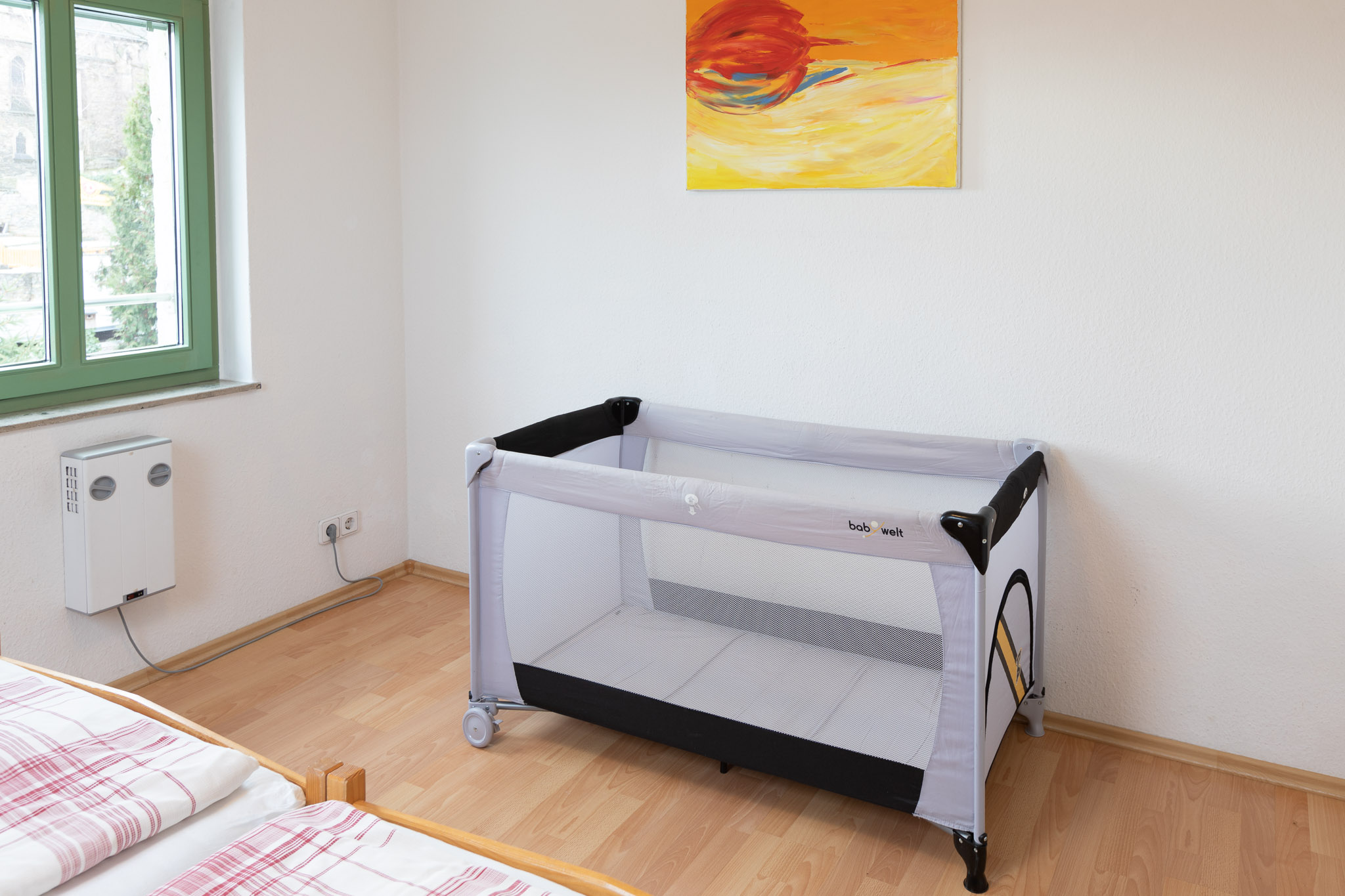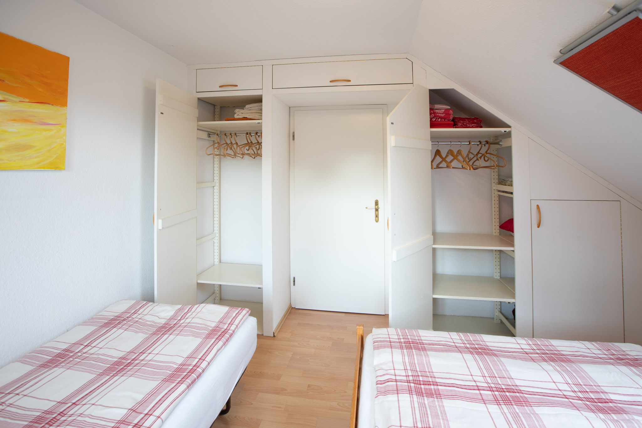 ein Doppelbett, ein Einzelbett, großer Einbauschrank, Kinder- oder Gitterbett auf Anfrage.